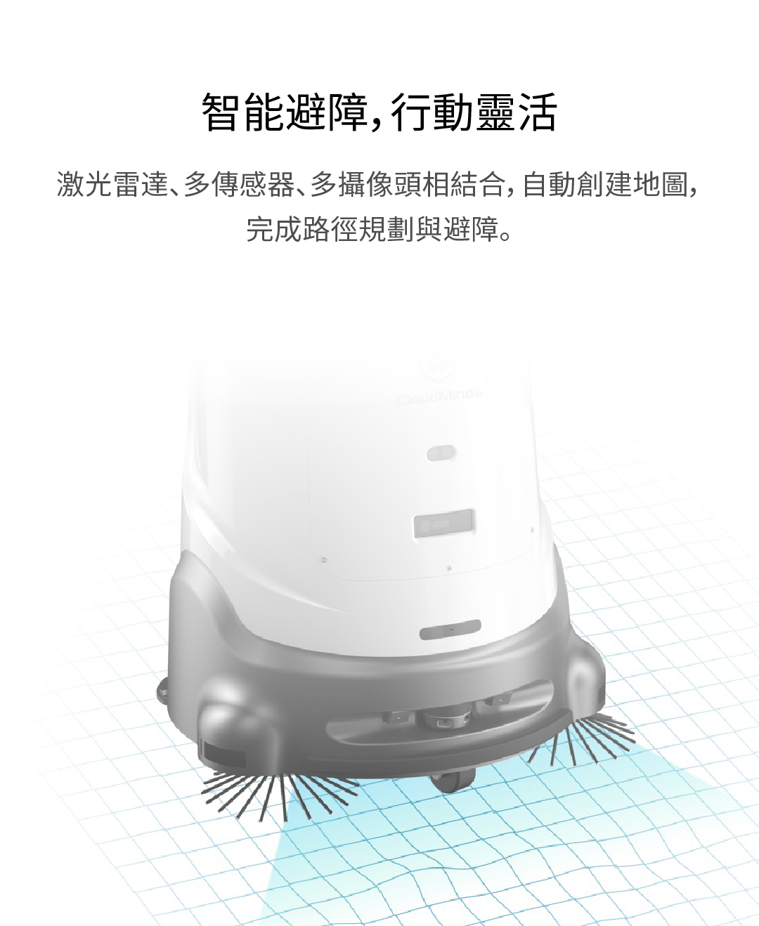 適用於多種複雜場景的無人化清潔消毒作業,省人省力安全高效 雲端管控 | 自主導航 | 清潔消毒 | 超長續航